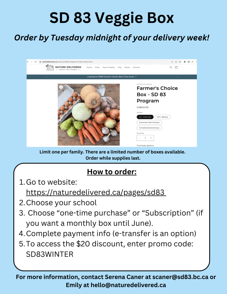 2. How do we order? Boxes are ordered and paid for online. Meat Box: sd83.yfmeats.ca Veggie Box: https://naturedelivered.ca/pages/sd83